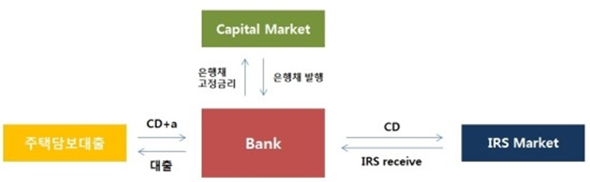 ● 은행 주도의 IRS 시장에서 은행 대출이 대부분 변동금리 조건으로 이루어지고 있다. 은행은 주택담보대출 등으로 수취하는 변동금리를 고정금리로 전환하고 싶어한다. 그러므로 스왑 시장에서 IRS receive (고정금리 수취) 거래를 통한 헤지를 한다. IRS Receive 수요가 몰리면서 한국은 IRS 금리가 낮게 형성되었다.
