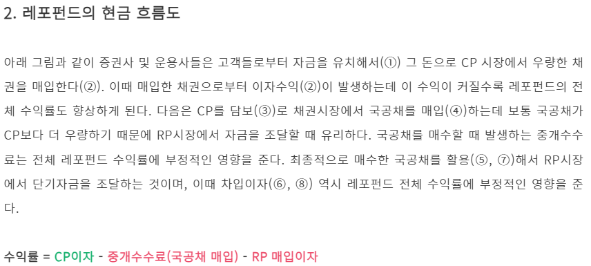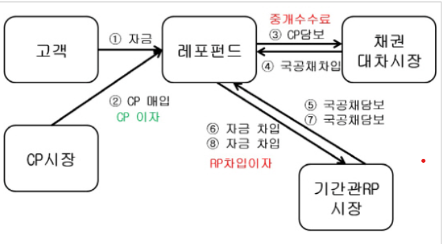 - 즉, 운용사나 증권사가 레포채권을 매도하고 시중은행 및 한국은행이 이 레포채권을 매입함으로써 시중에 자금을 공급하게 된다.