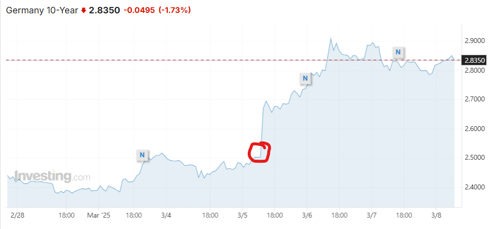 - Sell-off came after lawmakers from parties widely expected to form Germany’s next coalition government agreed to reform historic debt policy rule to allow an increase in national defense spending(GDP 1%)