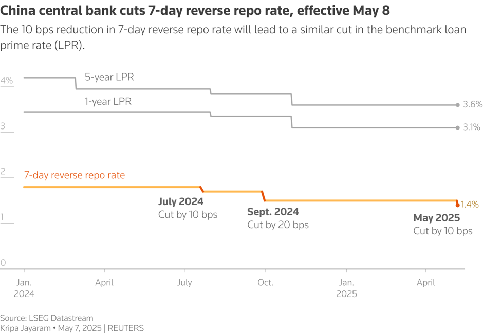 - China's central bank will lower the borrowing cost of its seven-day reverse repurchase agreements, its benchmark interest rate, by 10 basis points (bps) to 1.40%, effective May 8. Other interest rates will drop in line with the key rate.
